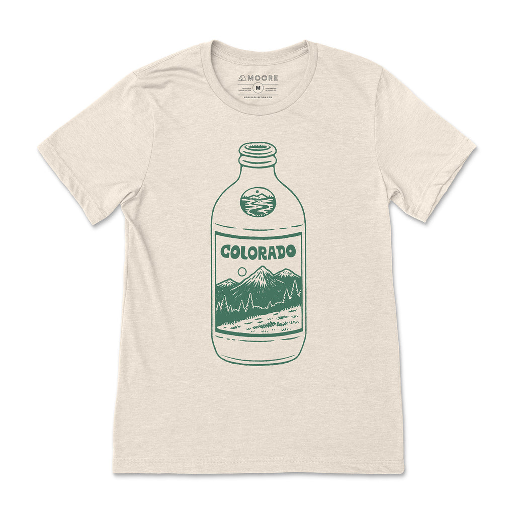 Our Colorado Bottle Tee in dust is a screen printed t-shirt with green water-based ink. With a retail fit, this incredibly soft t-shirt is a heather blend made out of 52% Airlume combed and ring-spun cotton & 48% polyester. Our soft t-shirts are unisex in wear.