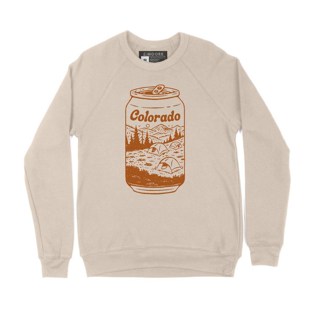 Our Colorado Can Crewneck in dust is a screen printed sweatshirt with burnt orange plastisol ink. This soft sweatshirt is made out of 50% ringspun cotton, 37.5% polyester fleece, and 12.5% rayon. This cute crewneck sweatshirt has unisex sizing.