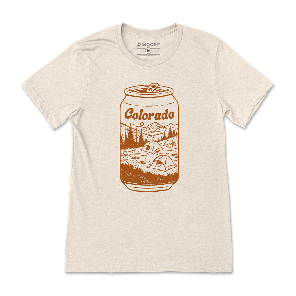 The Colorado Can Tee– Oatmeal features a Colorado design screen printed with burnt orange water-based ink. Made from a super-soft tri-blend of 50% polyester, 25% Airlume combed and ring-spun cotton, and 25% rayon, this tee offers a lightweight retail fit and is unisex in wear—perfect for trail days, local pride, or everyday adventures.