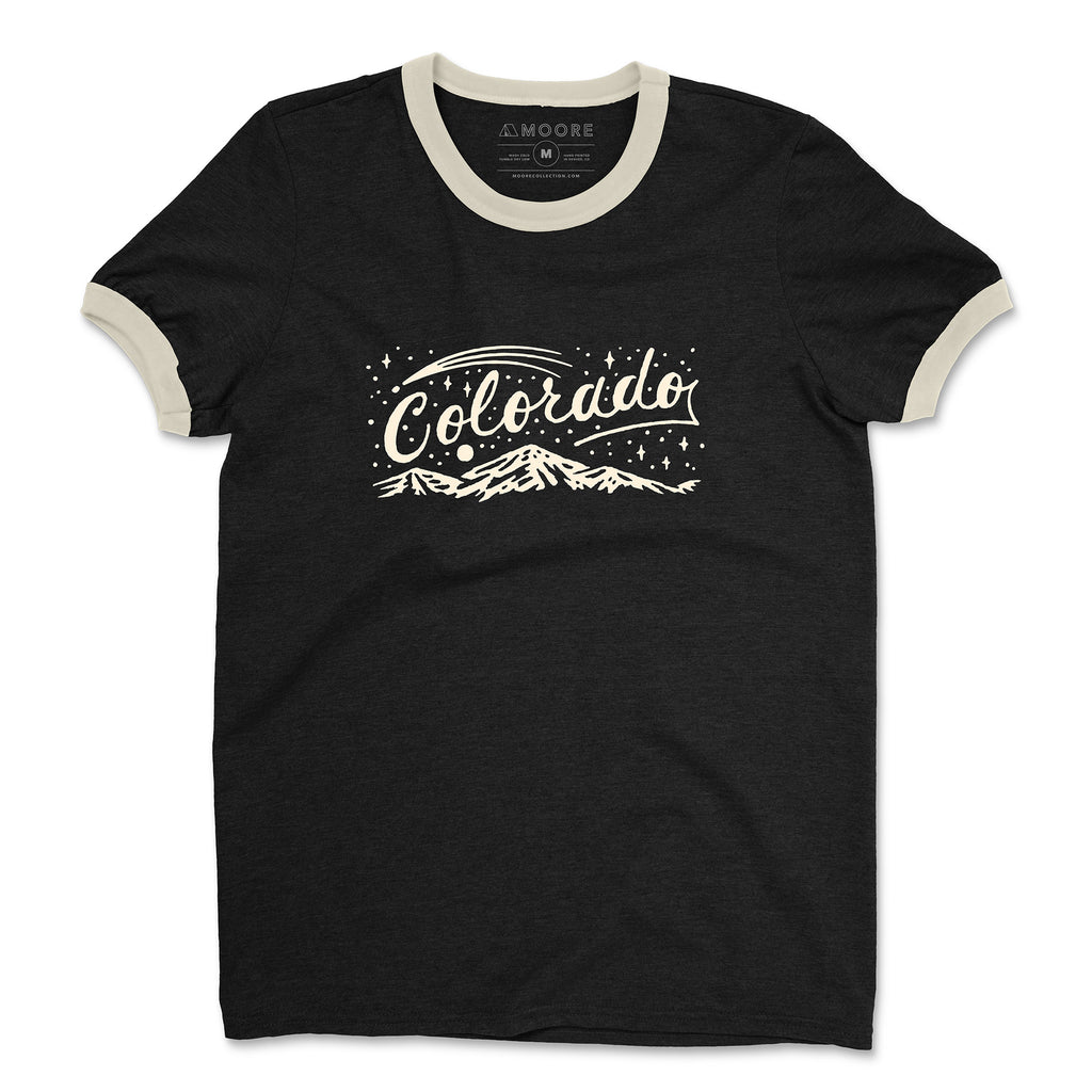 Our Colorado Night Ringer Tee in Black/Natural is a screen printed t-shirt cream ink. With a retail fit, this incredibly soft t-shirt is made out of a 100% Airlume combed and ring-spun cotton. Our soft t-shirts are unisex in wear.