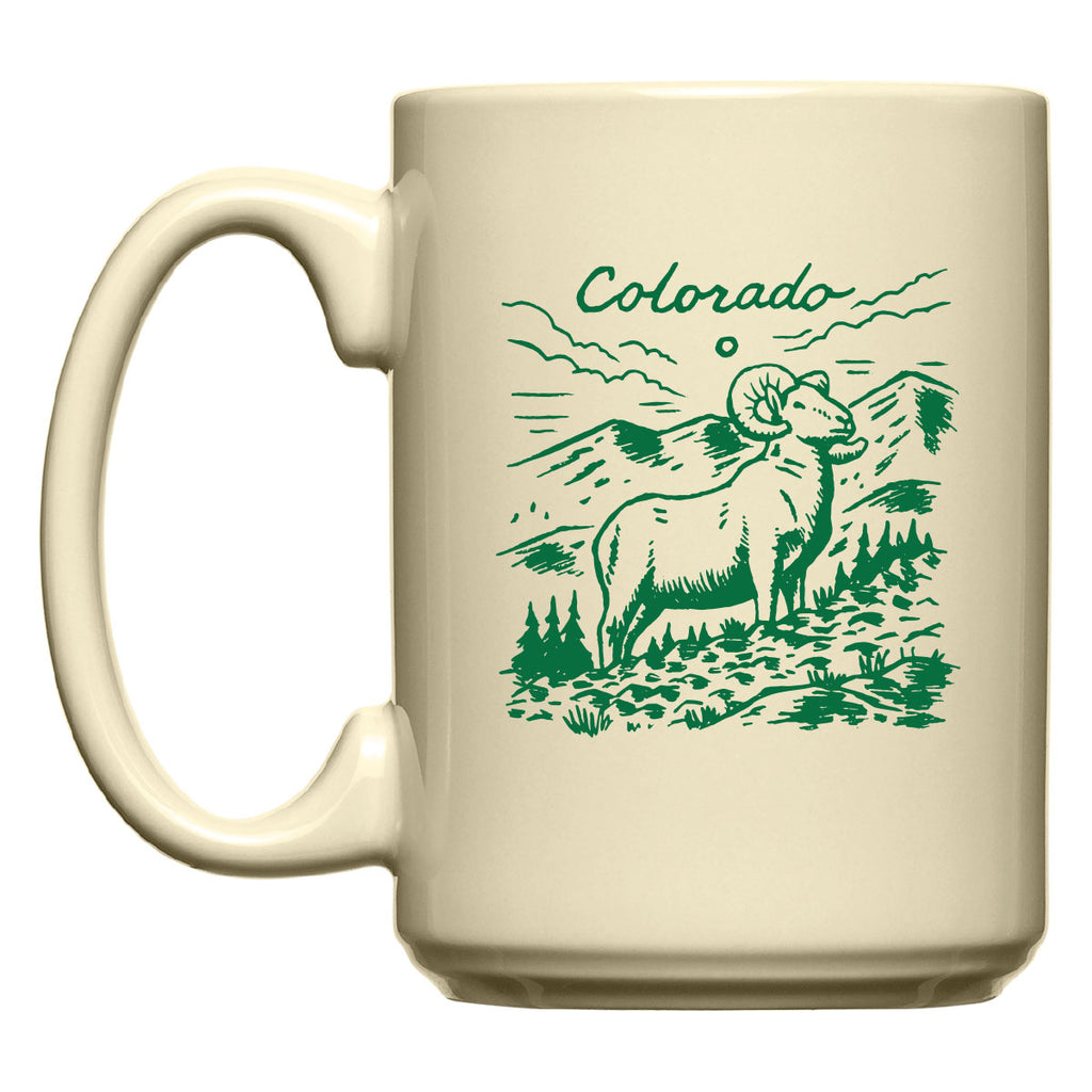 Celebrate mountain mornings with our 15oz Colorado Diner Mug. Featuring a classic cream ceramic body and deep green Colorado-inspired print, this sturdy mug is built for early risers, crisp air, and strong coffee.
