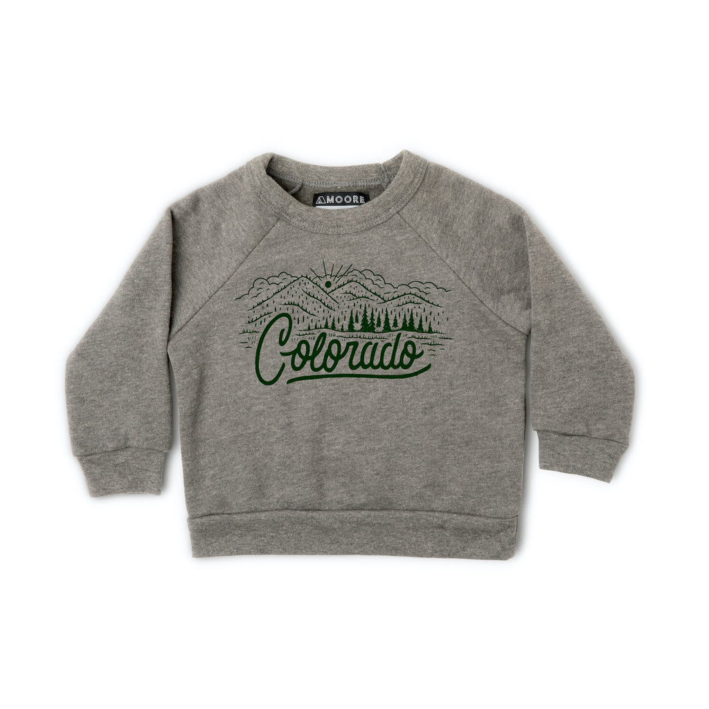Our Kids Colorado Crewneck in gray is a screen printed sweatshirt with green plastisol ink. This soft sweatshirt is made out of 50% ringspun cotton, 37.5% polyester fleece, and 12.5% rayon.