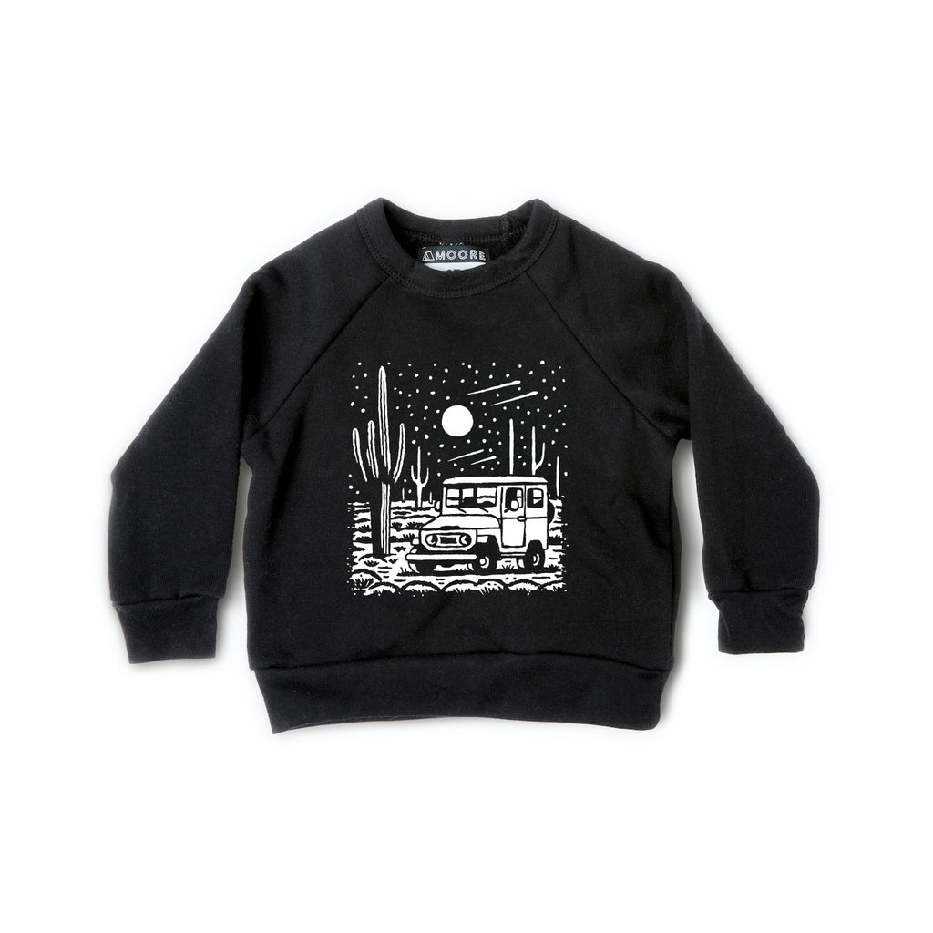 Our Kids Desert Cruiser Crewneck in black is a screen printed sweatshirt with white plastisol ink. This soft sweatshirt is made out of 50% ringspun cotton, 37.5% polyester fleece, and 12.5% rayon.