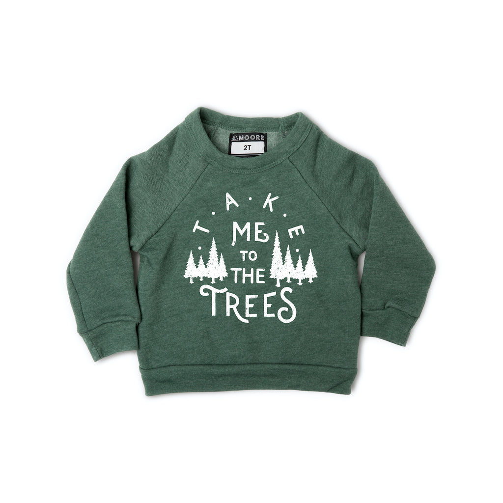 Our Kids Trees Crewneck in forest is a screen printed sweatshirt with white plastisol ink. This soft sweatshirt is made out of 50% ringspun cotton, 37.5% polyester fleece, and 12.5% rayon.