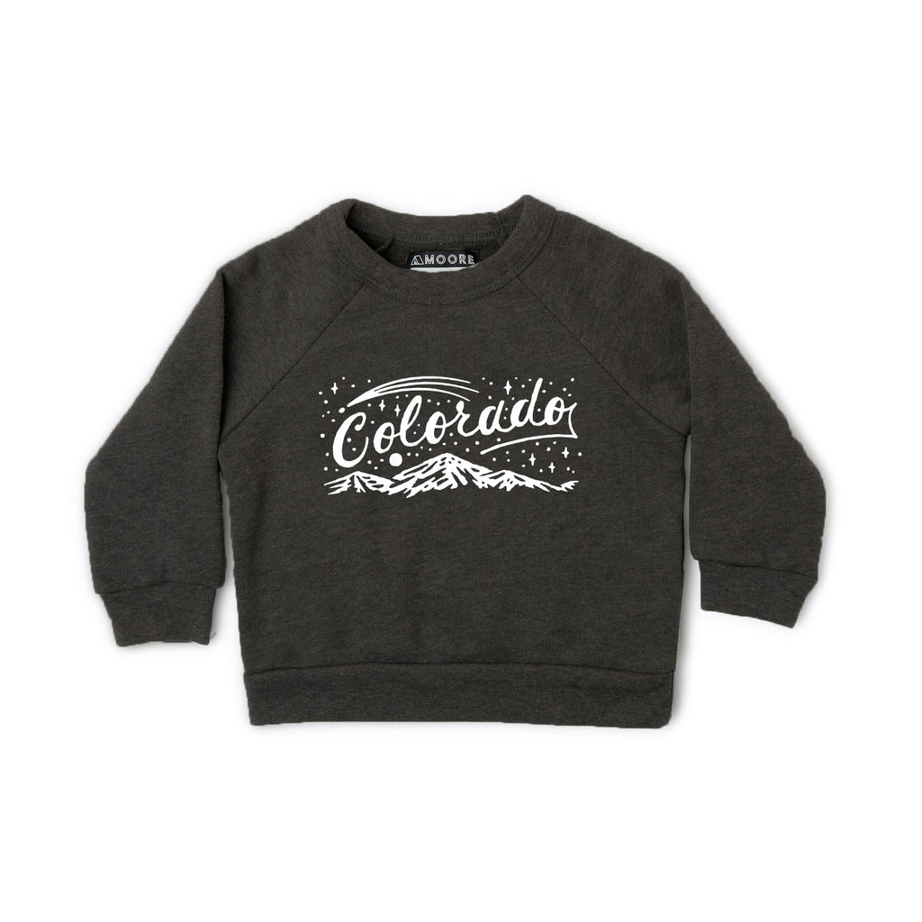 Our Kids Colorado Night Crewneck in dark gray is a screen printed sweatshirt with white plastisol ink. This soft sweatshirt is made out of 50% ringspun cotton, 37.5% polyester fleece, and 12.5% rayon.
