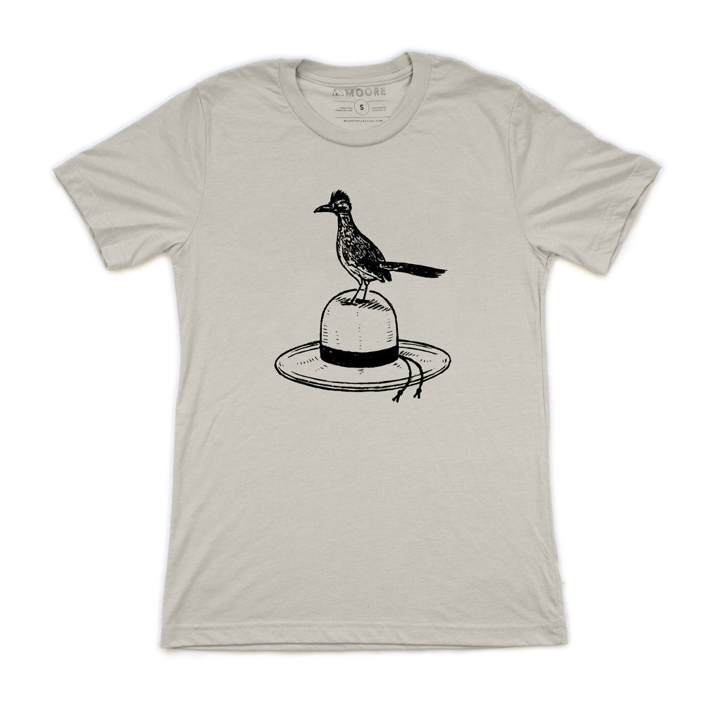 Our Road Runner Tee in cement is a screen printed t-shirt with black water-based ink. With a retail fit, this incredibly soft t-shirt is a tri-blend made of 50% polyester, 25% Airlume combed and ring-spun cotton, 25% rayon. Our soft t-shirts are unisex in wear.