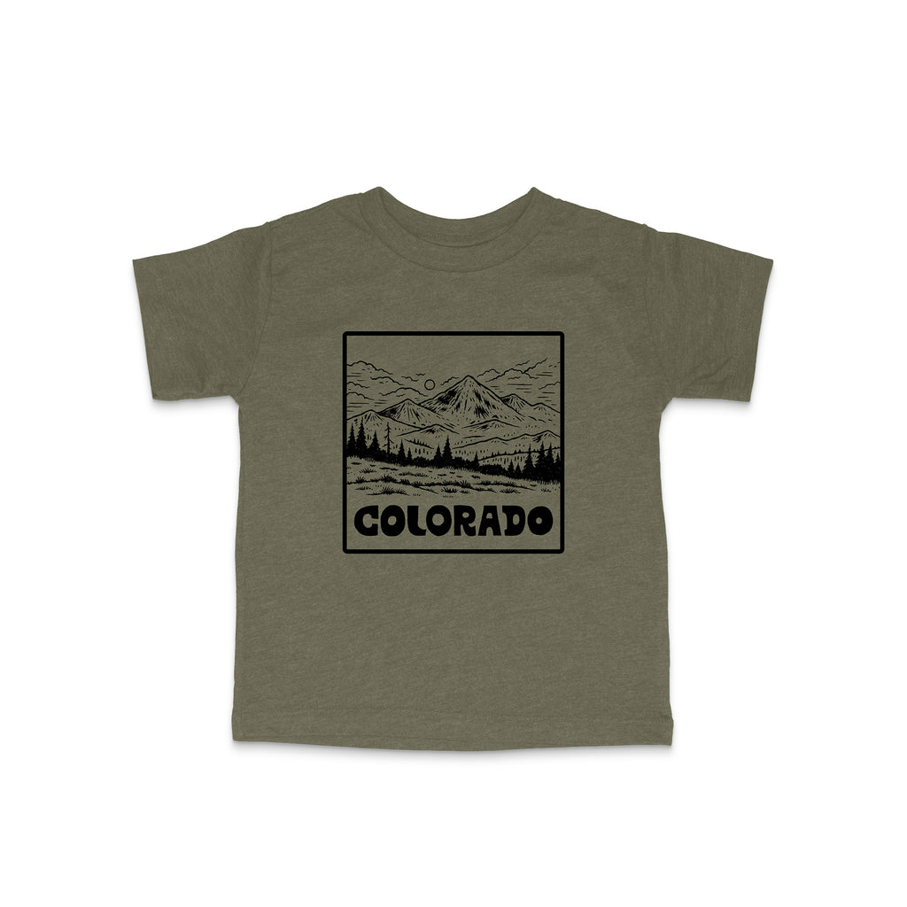 Our Colorado Alpine Kids Tee in olive is a screen printed kids graphic tee with black water-based ink. This incredibly soft kids t shirt is made out of a tri-blend of 50% polyester, 25% ringspun cotton, and 25% rayon.